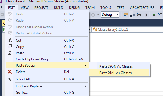 - From within Visual Studio, select Edit -> Paste Special -> Paste [XML or JSON] as Classes